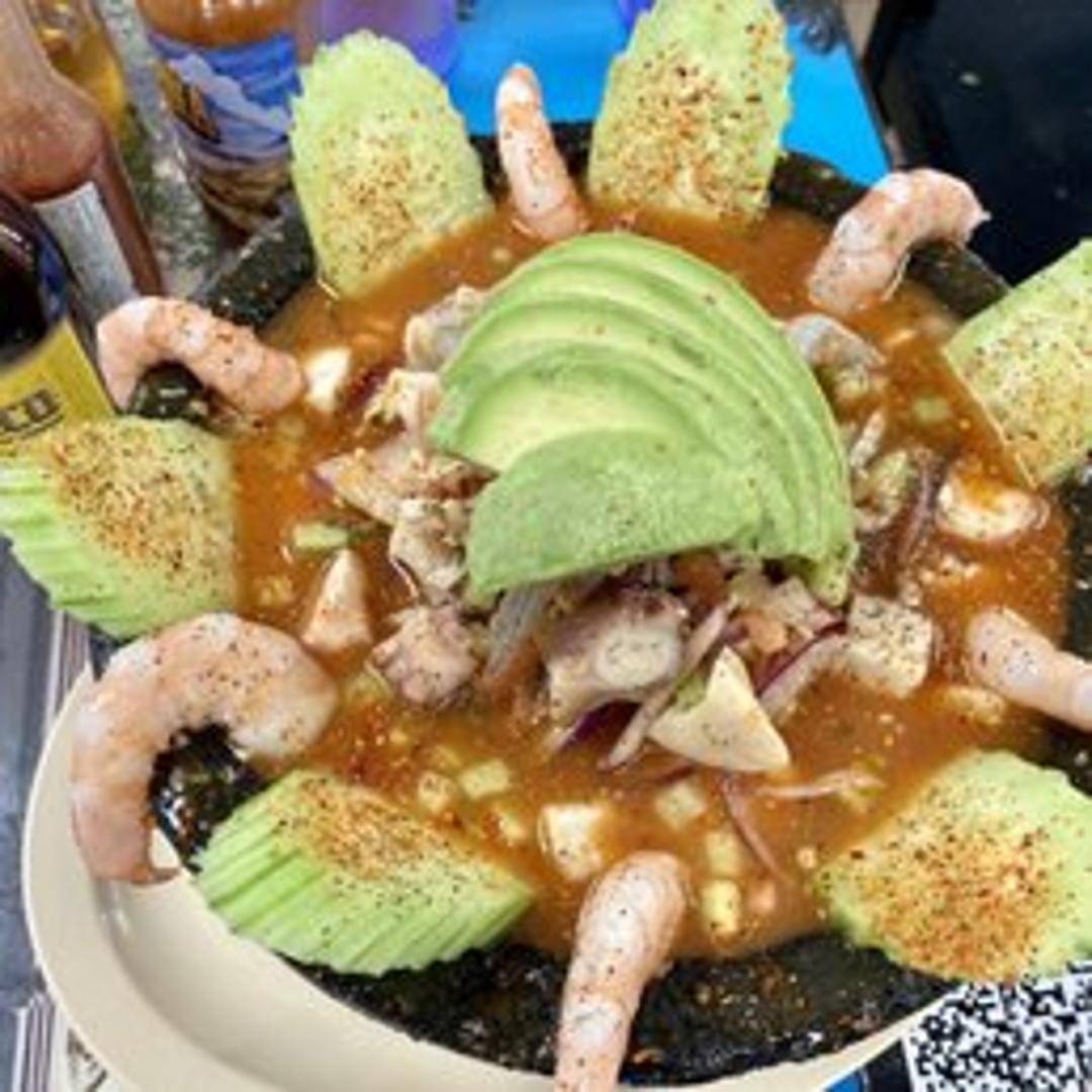 A large, mixed seafood ceviche with a variety of seafood. It could include shrimp, fish, octopus, scallops, and possibly other shellfish. Marinated in lime juice with tomatoes, onions, cilantro, and peppers. A substantial and flavorful dish.