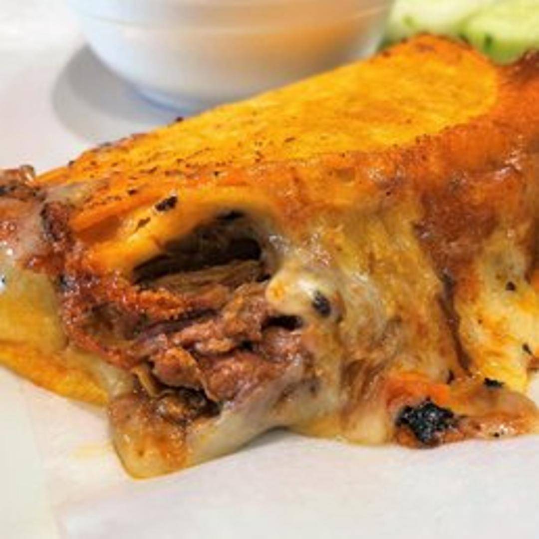 A cheesy taco filled with slow-cooked, shredded birria meat (typically beef or goat) and served with a side of consommé for dipping.