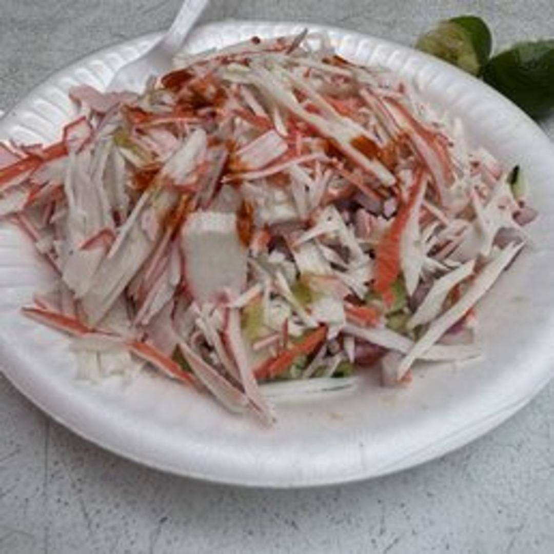Crispy tostada topped with shrimp, lettuce, tomatoes, onions, avocado, and a creamy sauce.