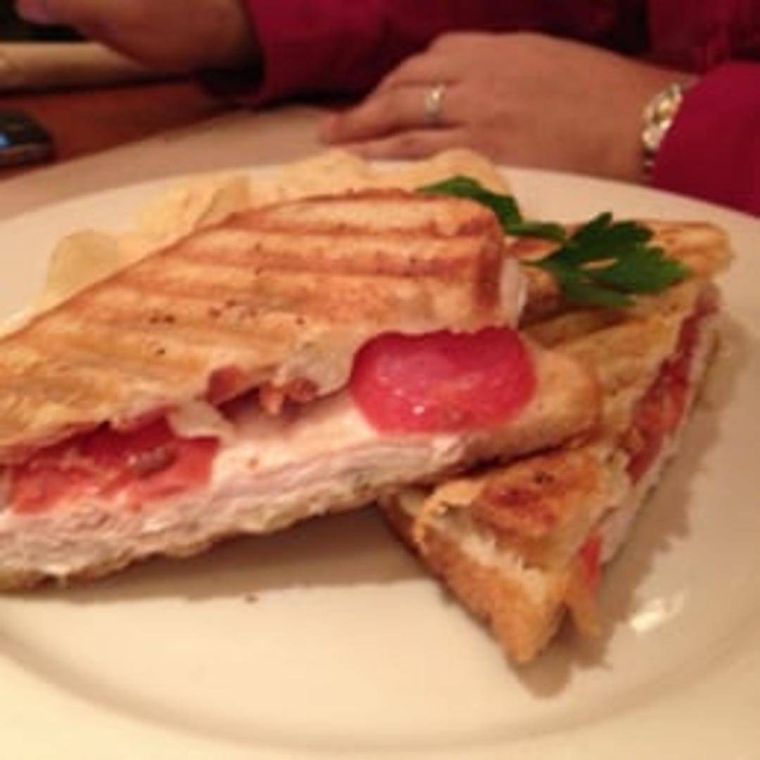 Experience a classic reimagined with our Turkey Club Panini. Slices of tender roasted turkey breast, crispy Applewood smoked bacon, fresh crisp lettuce, juicy ripe tomatoes, and melted provolone cheese are perfectly pressed between slices of artisanal bread until golden and warm, creating a satisfying crunch with every bite.