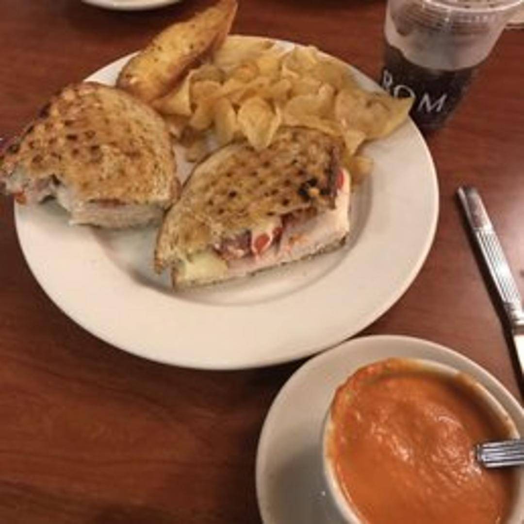 A satisfying grilled sandwich featuring tender slices of premium roasted turkey breast layered with creamy, melted Swiss cheese. Pressed between slices of artisan bread until golden brown and crispy, this panini offers a warm and comforting combination of savory flavors and satisfying textures.