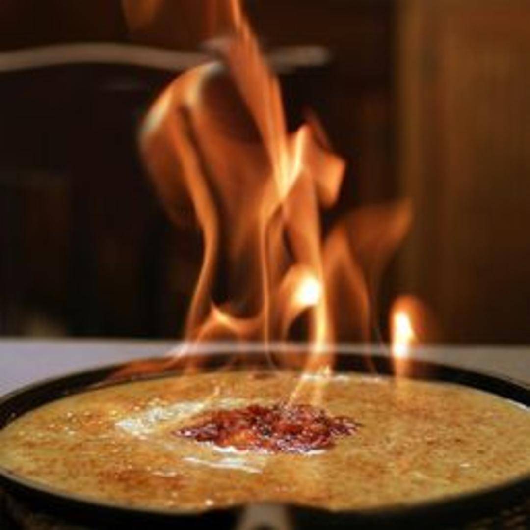 A creamy, melted cheese dip served with a fiery presentation. Typically includes a blend of cheeses and spices, often served with tortilla chips for dipping.