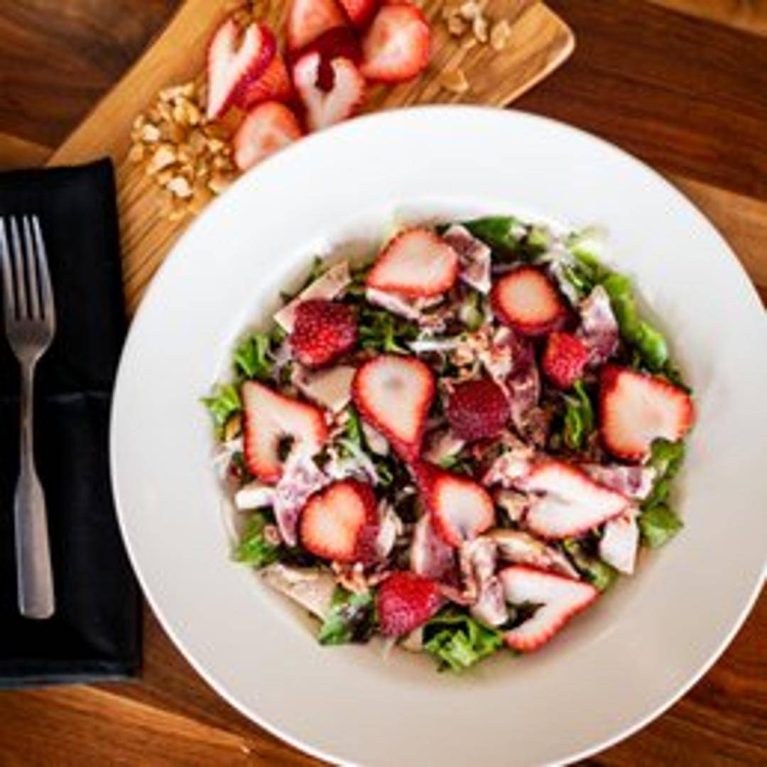 Grilled chicken breast served atop a bed of mixed greens with seasonal berries, crumbled blue cheese, candied pecans, and a raspberry vinaigrette dressing.