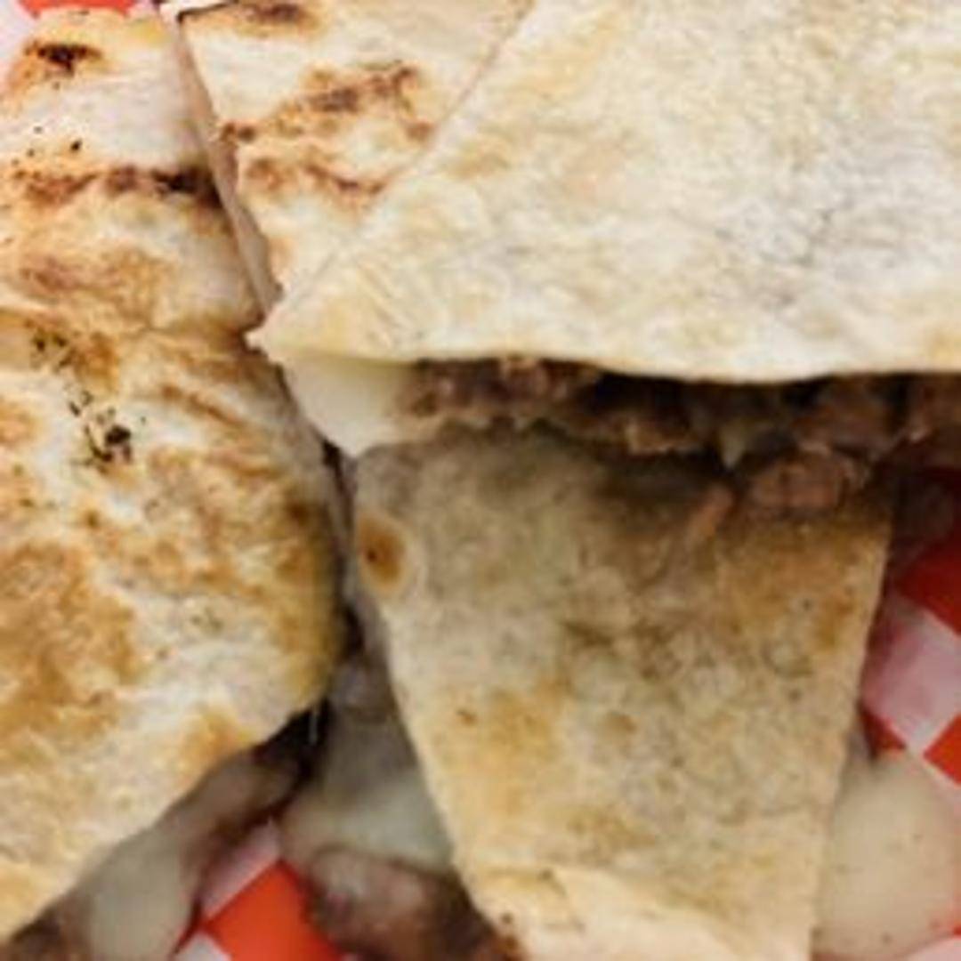 A grilled flour tortilla filled with cheese and grilled steak (asada). Served with sour cream and guacamole.
