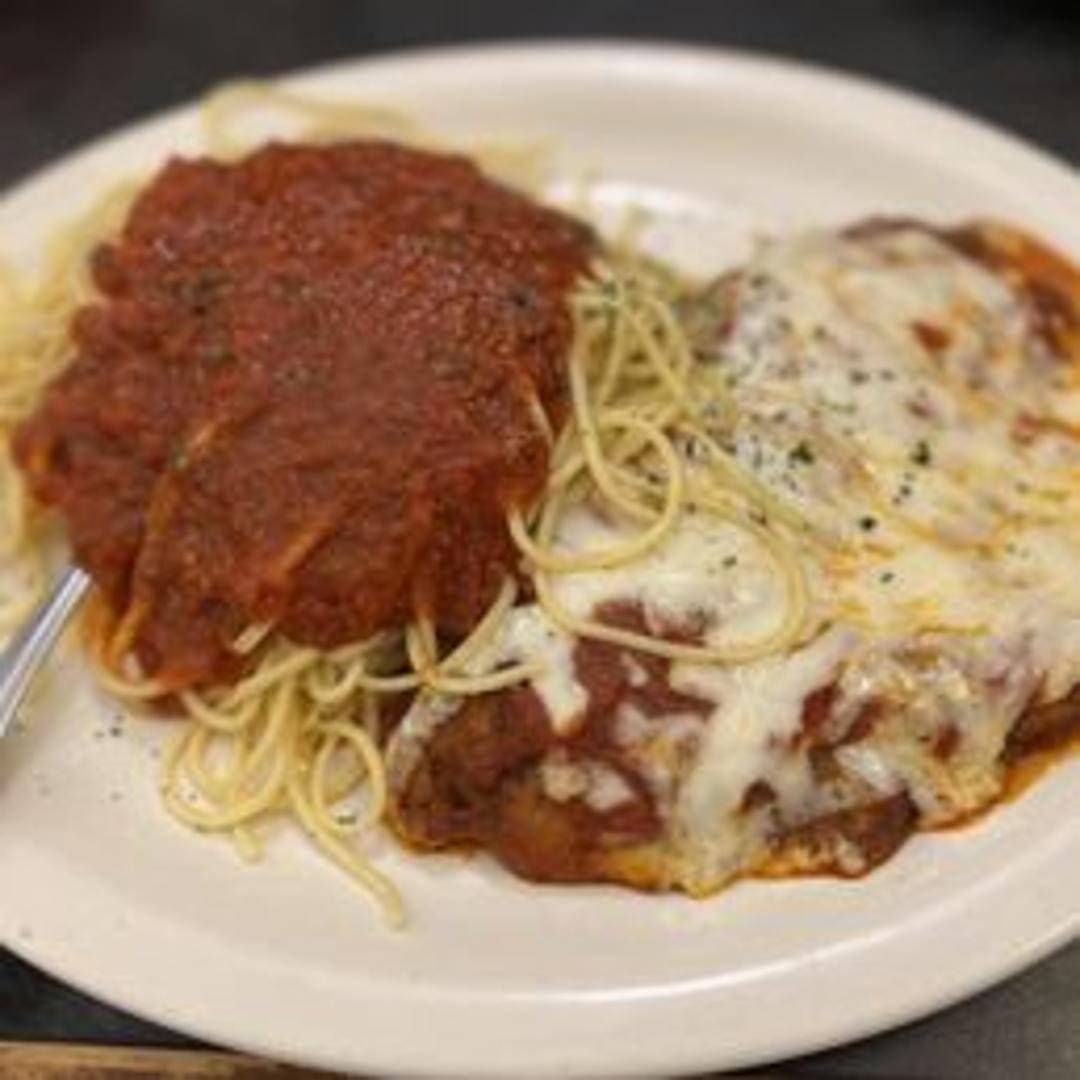 A crispy, breaded chicken breast topped with marinara sauce and melted mozzarella cheese, served on a toasted Italian roll.