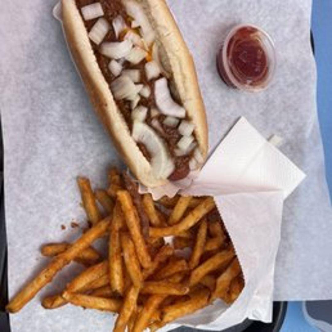 A grilled all-beef hot dog smothered in Marty's homemade chili, topped with melted cheddar cheese, and served on a soft, steamed bun.