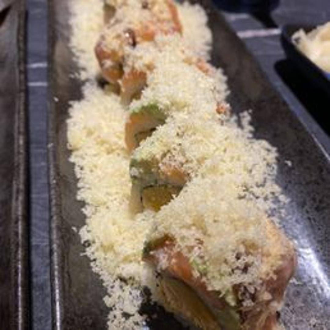 A sushi roll featuring fresh mango, crispy tempura flakes, and a sweet sauce. Offers a delightful combination of sweet, savory, and crunchy textures.
