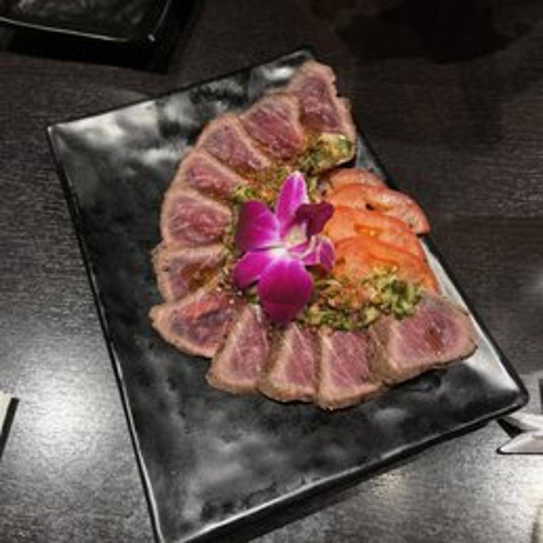 Thinly sliced, lightly seared beef served rare, typically accompanied by ponzu sauce, grated ginger, garlic, and scallions. Offers a delicate balance of textures and flavors.