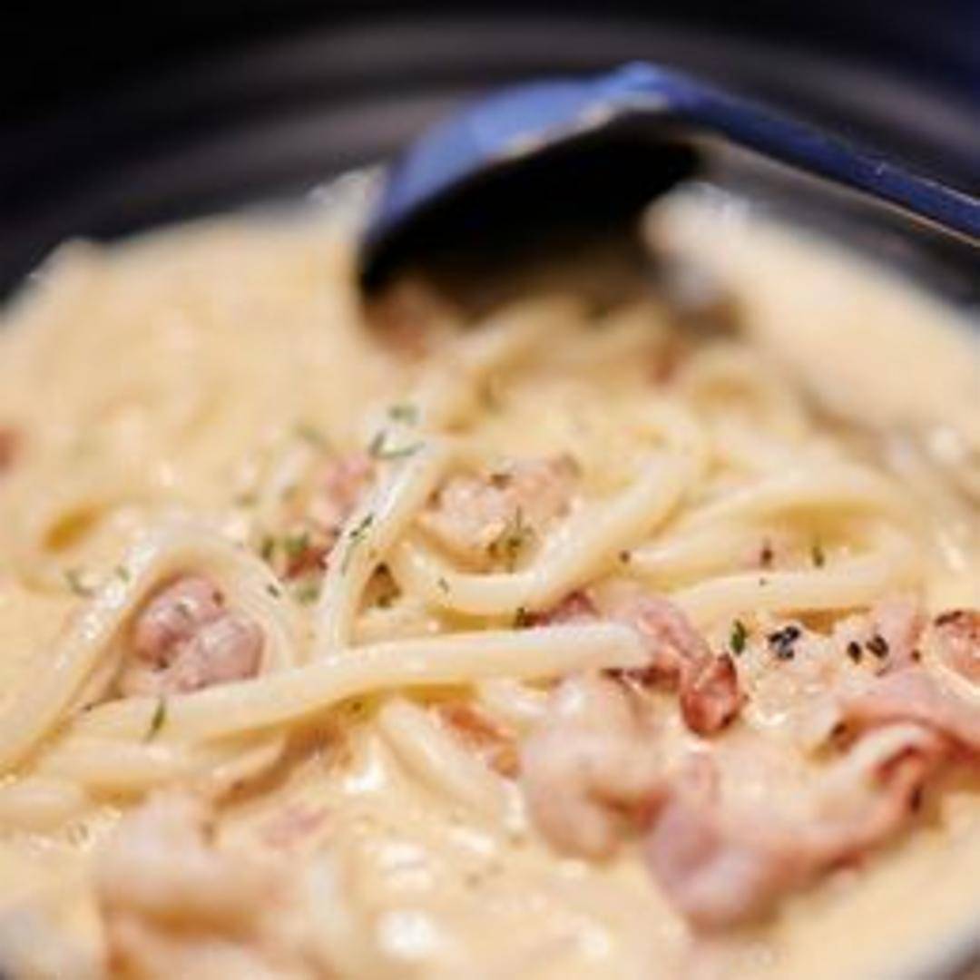 A unique fusion dish featuring thick udon noodles in a creamy carbonara sauce infused with the savory depth of miso. The dish often includes bacon or pancetta, egg yolk, and parmesan cheese, blending traditional Italian flavors with Japanese umami. Garnished with black pepper and sometimes nori.