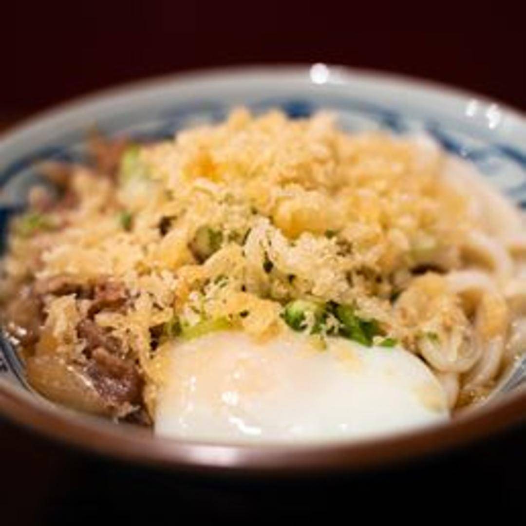 A flavorful udon noodle soup topped with thinly sliced beef and a soft-cooked egg (tama). The egg adds richness to the savory broth and tender beef, creating a balanced and delicious noodle dish. The combination of textures and flavors makes this a popular choice.