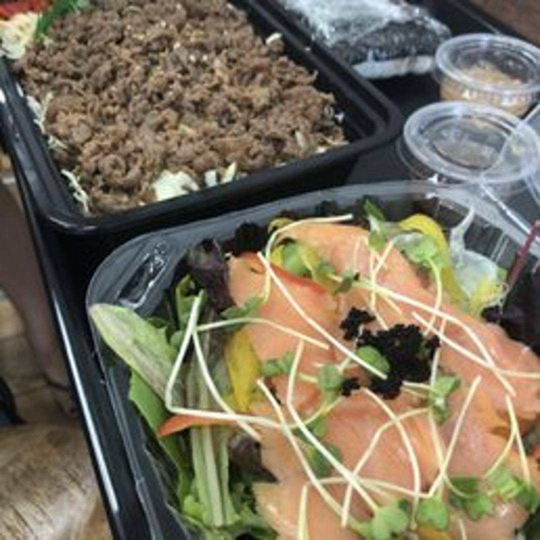 A refreshing salad featuring thinly sliced smoked salmon served atop a bed of mixed greens. Includes a variety of fresh vegetables such as cucumber, tomato, and carrots. Often accompanied by a light and tangy dressing, such as a lemon vinaigrette or Japanese-style dressing. May include seaweed salad or other complementary ingredients depending on availability.