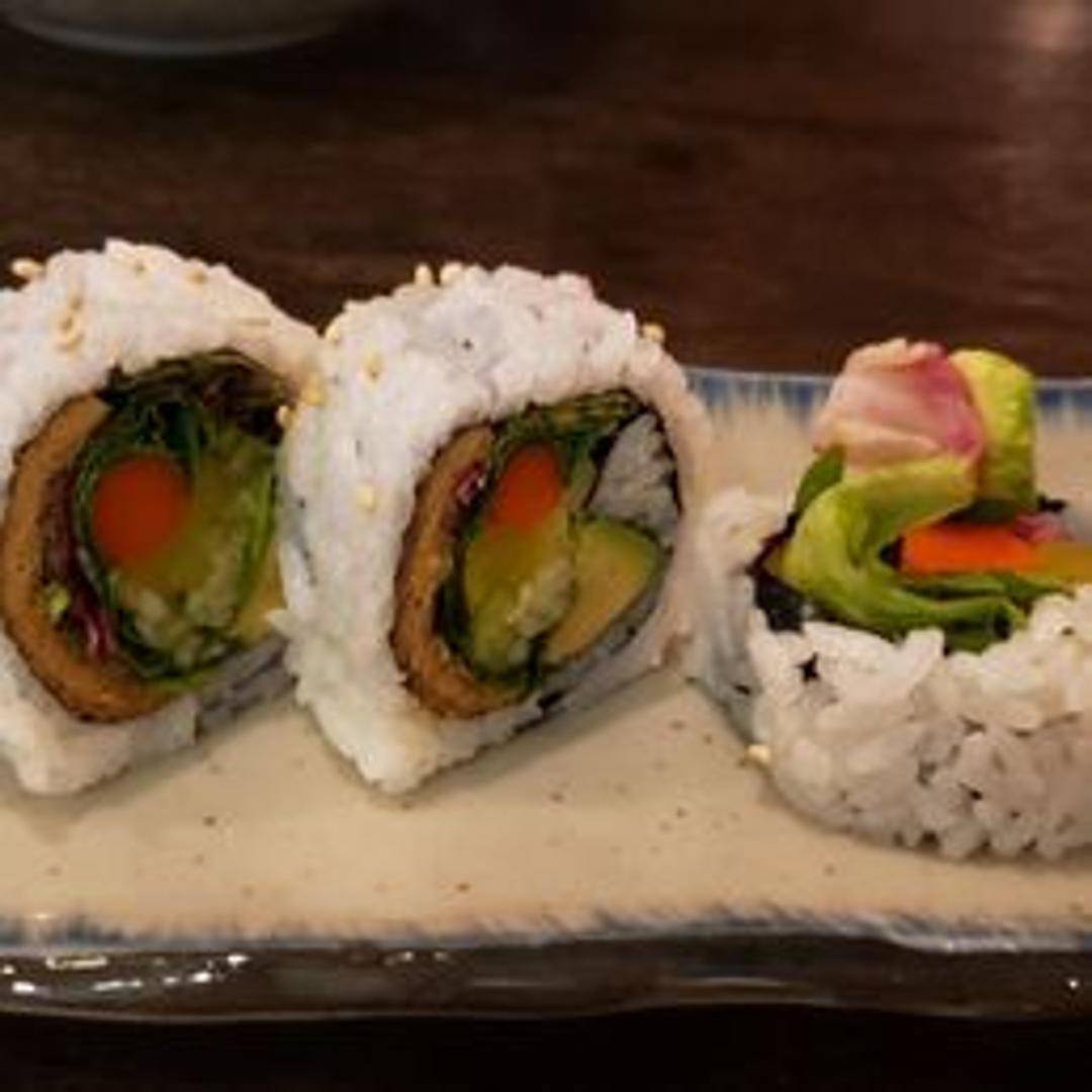 A sushi roll filled with a variety of fresh, crisp vegetables. Common ingredients include cucumber, avocado, carrots, lettuce, asparagus, and pickled radish (daikon). Wrapped in seaweed (nori) and sushi rice, and often served with soy sauce, ginger, and wasabi.