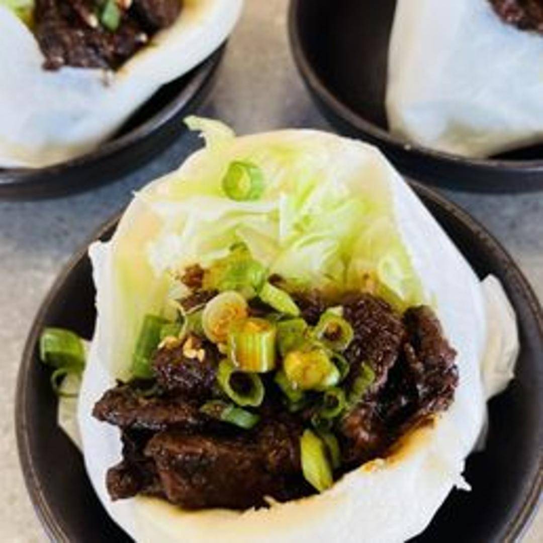 A fluffy, steamed bun filled with seasoned beef. A savory and satisfying handheld snack or meal.