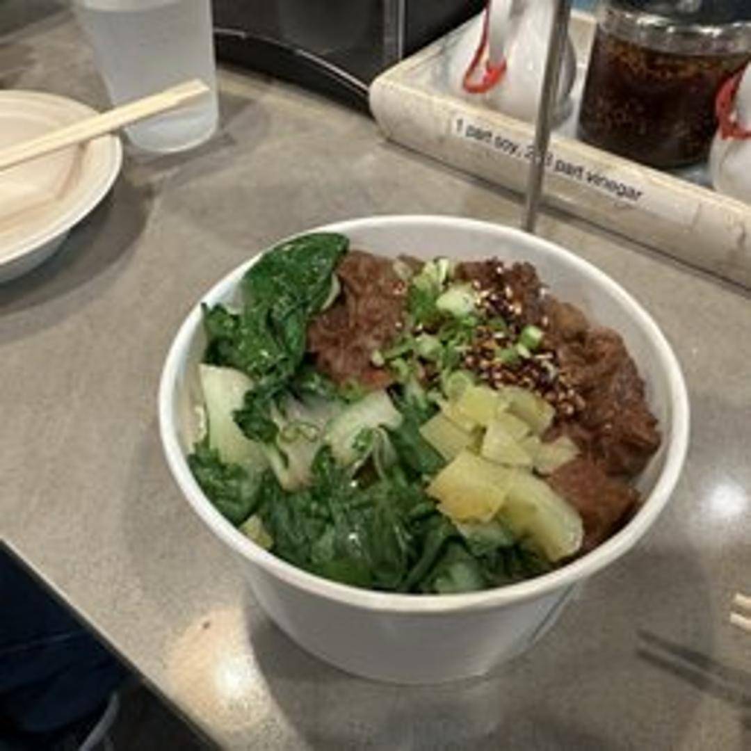 Tender, slow-cooked Angus beef stew served over a bed of fluffy steamed rice. The beef is braised in a rich, savory sauce, often containing soy sauce, ginger, garlic, and other aromatic spices, creating a comforting and hearty meal.