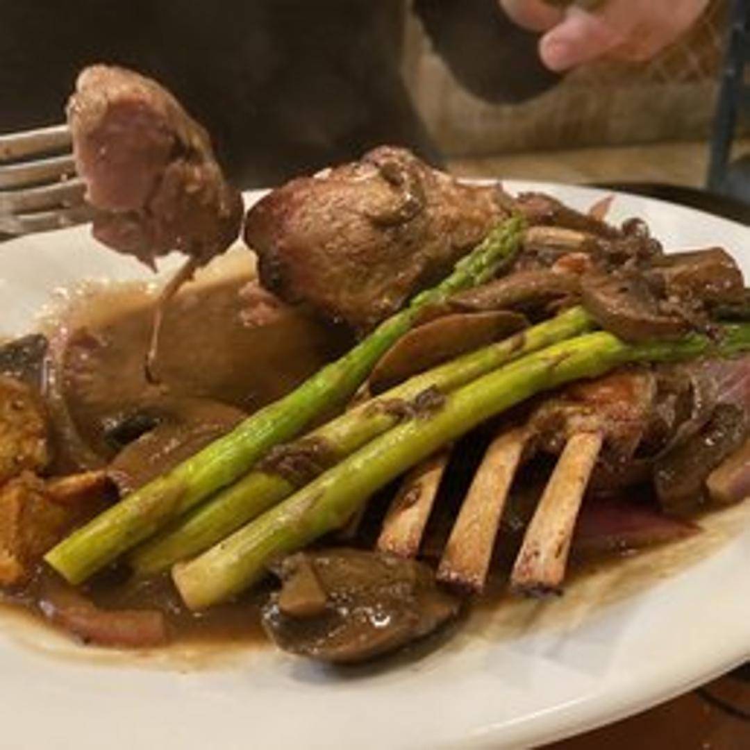A succulent rack of lamb, expertly prepared and stuffed with a savory blend of seasoned breadcrumbs, herbs, and possibly a touch of Italian cheese. Roasted to perfection, offering a tender and flavorful culinary experience.