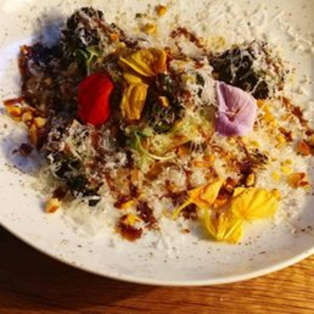 Tender broccoli florets grilled over wood, offering a smoky char and subtle bitterness enhanced by the natural sweetness of the vegetable. Often seasoned with olive oil, salt, and pepper, potentially with a touch of lemon or garlic.