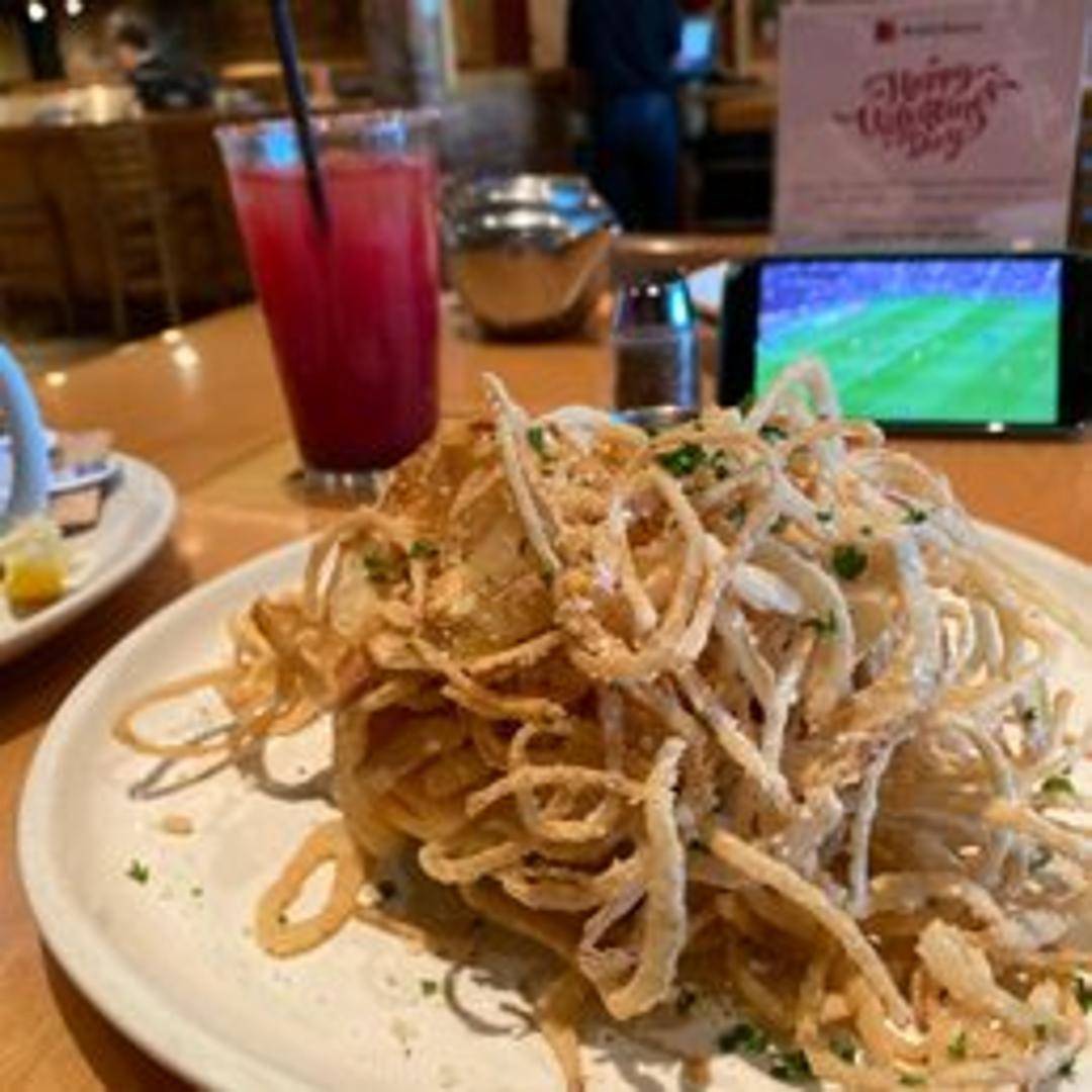 Delicately thin slices of sweet onions, lightly breaded and fried to a golden, crispy perfection. These savory straws offer a delightful crunch and a natural onion flavor, perfect as an appetizer or a flavorful garnish.