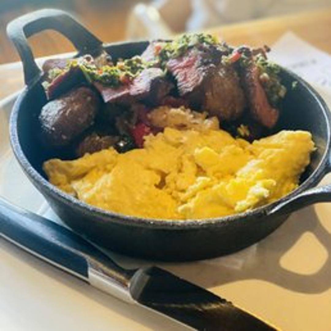 A classic breakfast or brunch staple featuring a perfectly cooked steak, typically tender and flavorful, served alongside eggs prepared to your preference. Often accompanied by crispy breakfast potatoes or a similar side, this dish offers a hearty and satisfying start to your day.