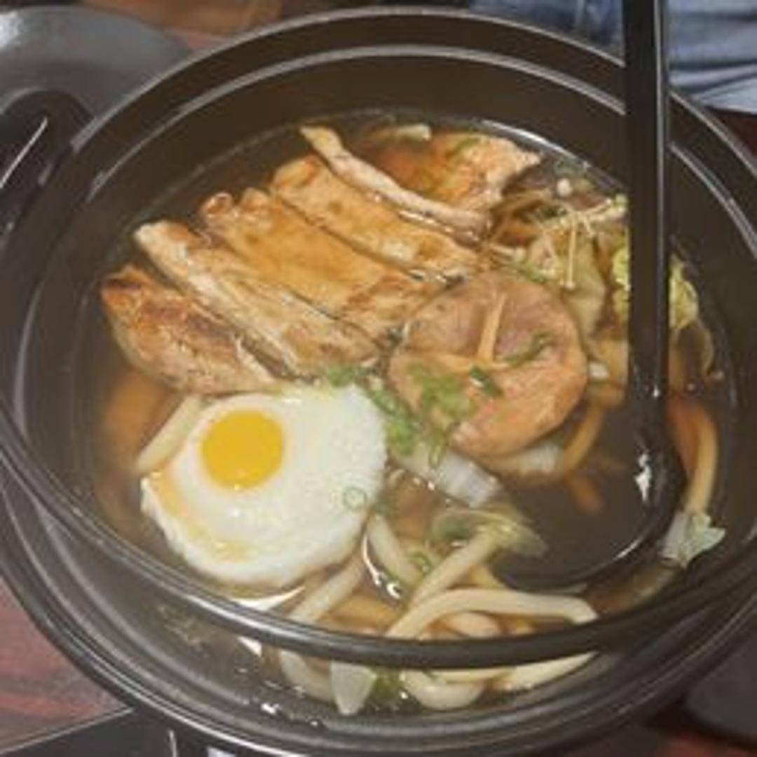 A comforting and hearty Japanese noodle soup served in a hot pot. Thick, chewy udon noodles simmered in a savory broth with chicken, egg, shrimp tempura, fish cake, mushrooms, and vegetables. Served piping hot in a traditional earthenware pot.