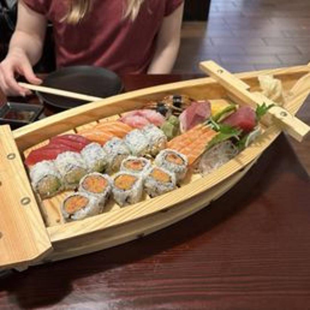 A chef's selection of assorted fresh nigiri sushi and maki rolls, beautifully arranged on a decorative boat. Includes a variety of fish such as tuna, salmon, yellowtail, and white fish, along with classic maki rolls. Perfect for sharing or a satisfying individual meal. Served with ginger, wasabi, and soy sauce.