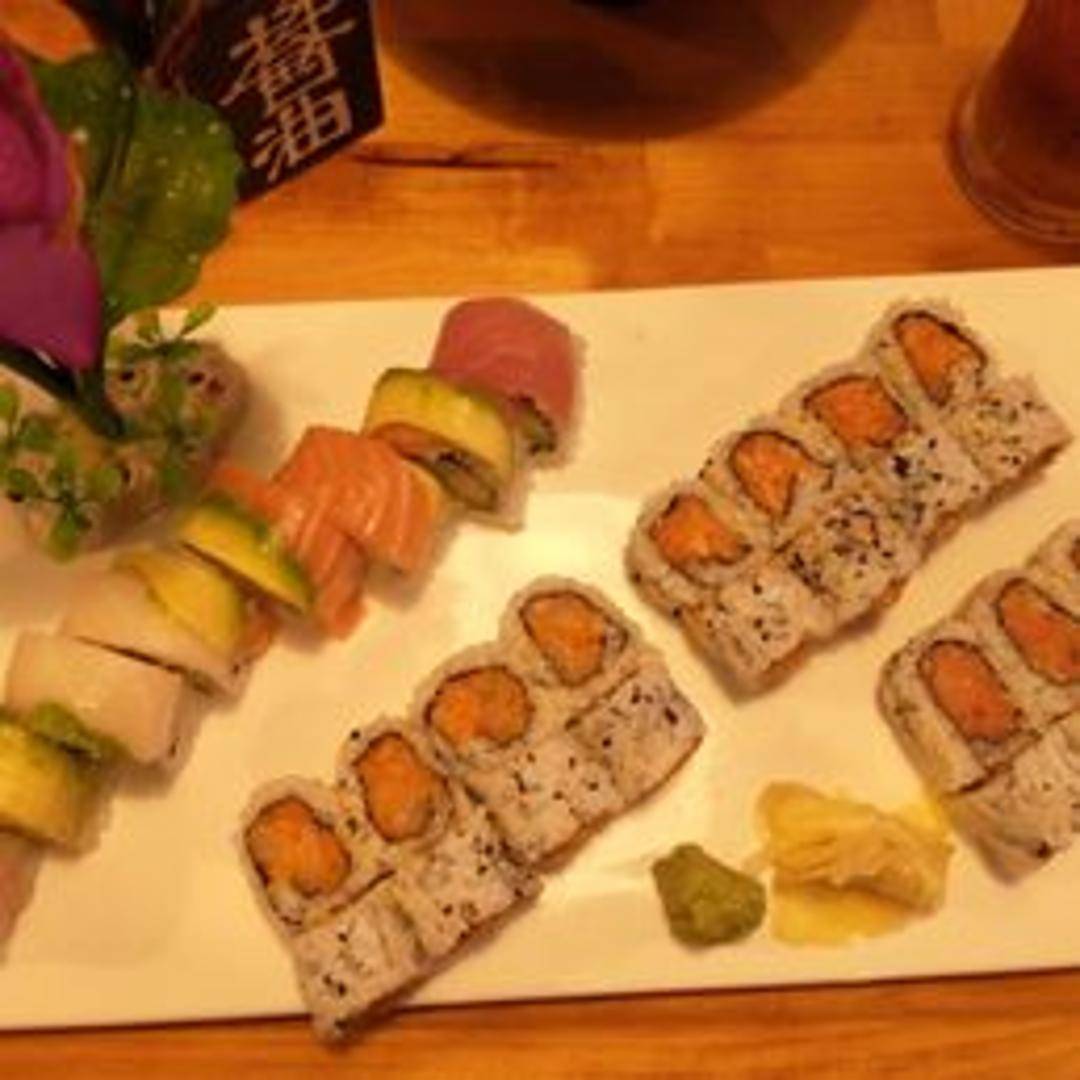 A visually stunning roll with a core of crab meat, cucumber, and avocado, topped with an assortment of thinly sliced fish such as tuna, salmon, and white fish. A delightful mix of textures and flavors.