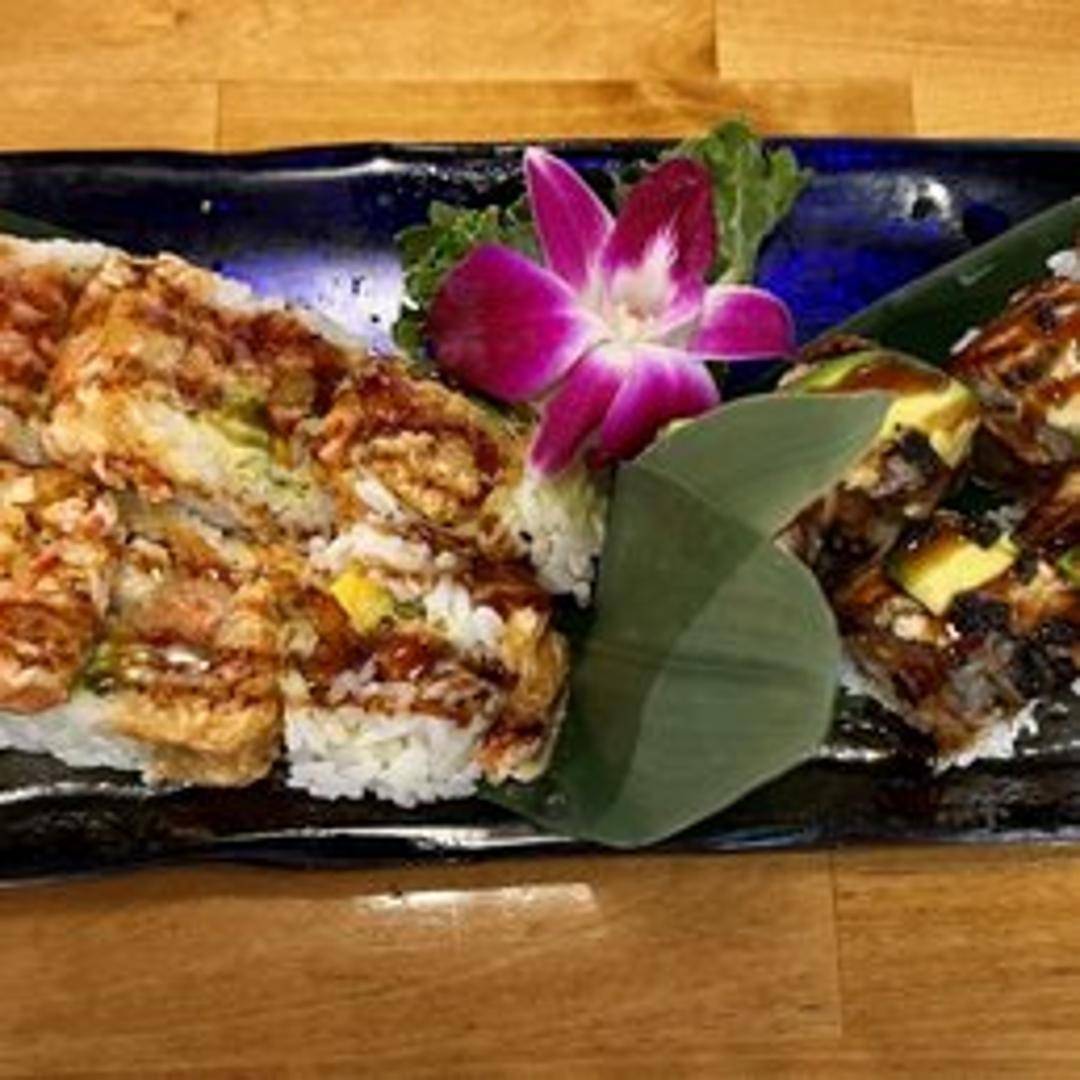 A specialty sushi roll featuring tempura shrimp, cucumber, and cream cheese, topped with avocado, eel sauce, and sesame seeds. A visually stunning and delicious combination of flavors and textures.