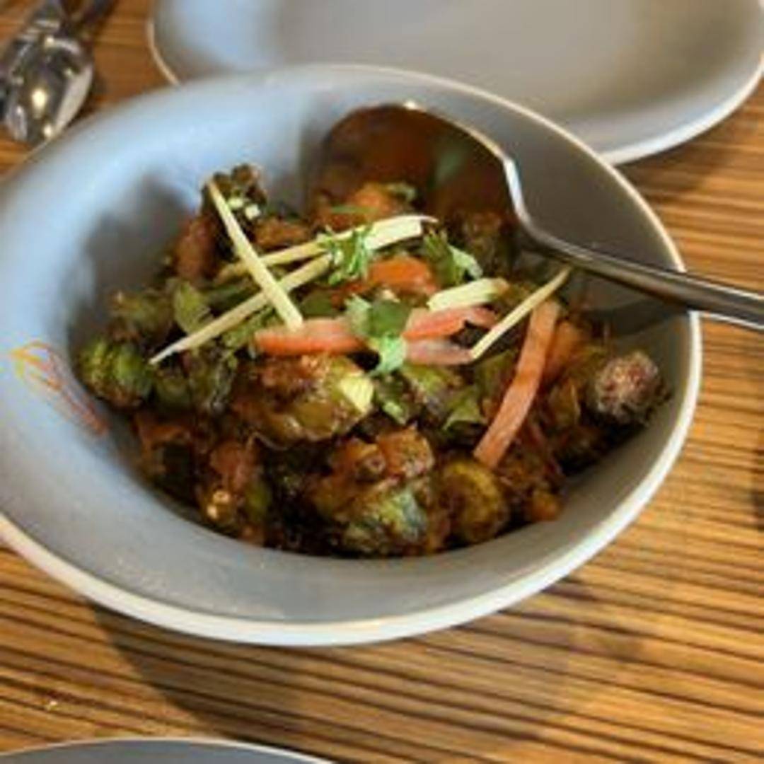 Okra cooked with onions, tomatoes, and a blend of aromatic spices in a dry and flavorful preparation.