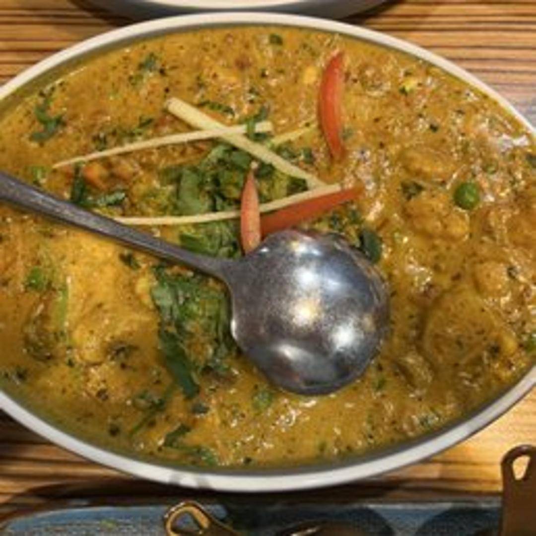 A medley of mixed vegetables cooked in a creamy and flavorful tomato-based gravy with cashew nuts, raisins, and aromatic spices, traditionally prepared in a handi (clay pot).