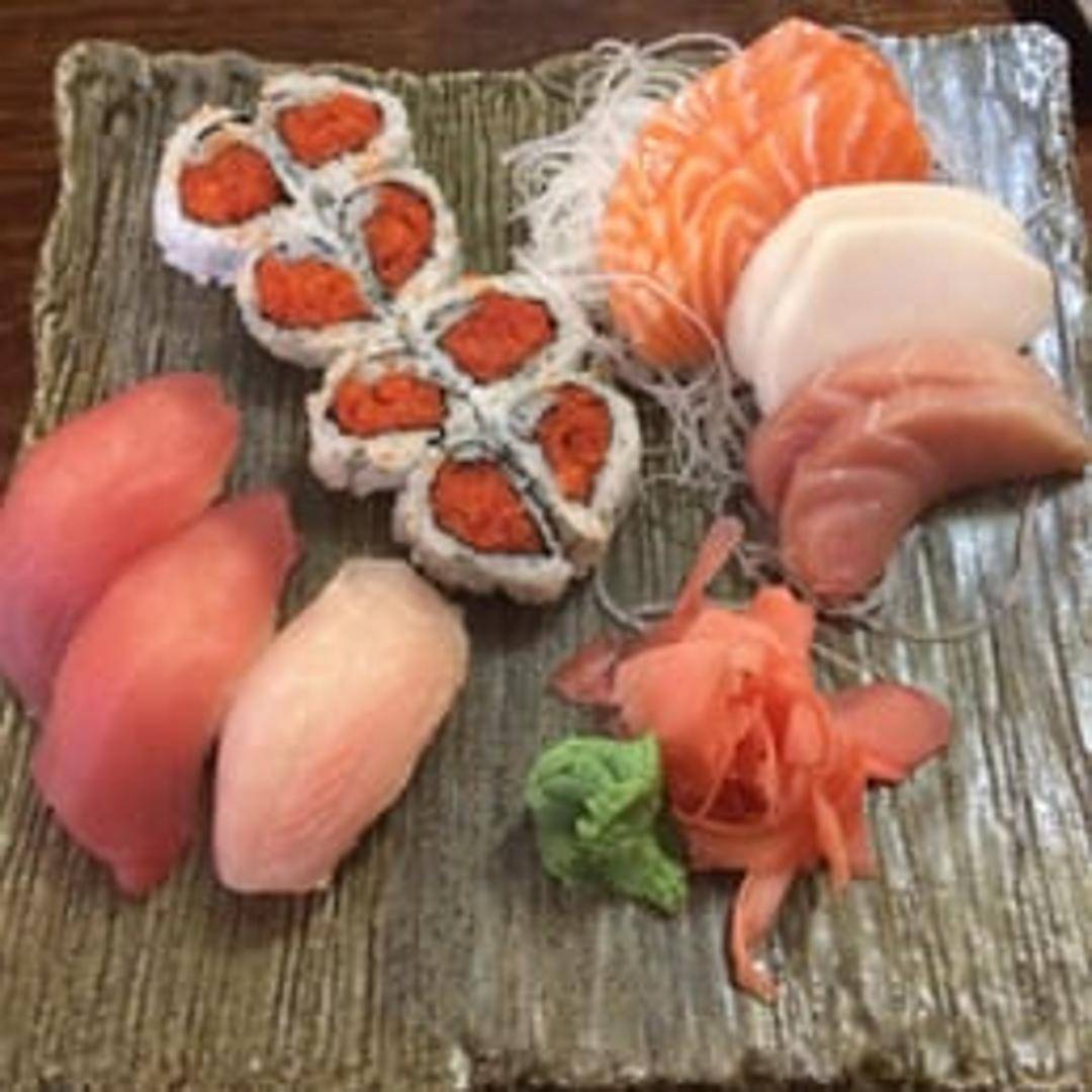 A delightful midday meal featuring a carefully curated selection of the chef's choice fresh sushi pieces and/or a classic sushi roll, typically accompanied by a refreshing side salad and a soothing cup of miso soup.