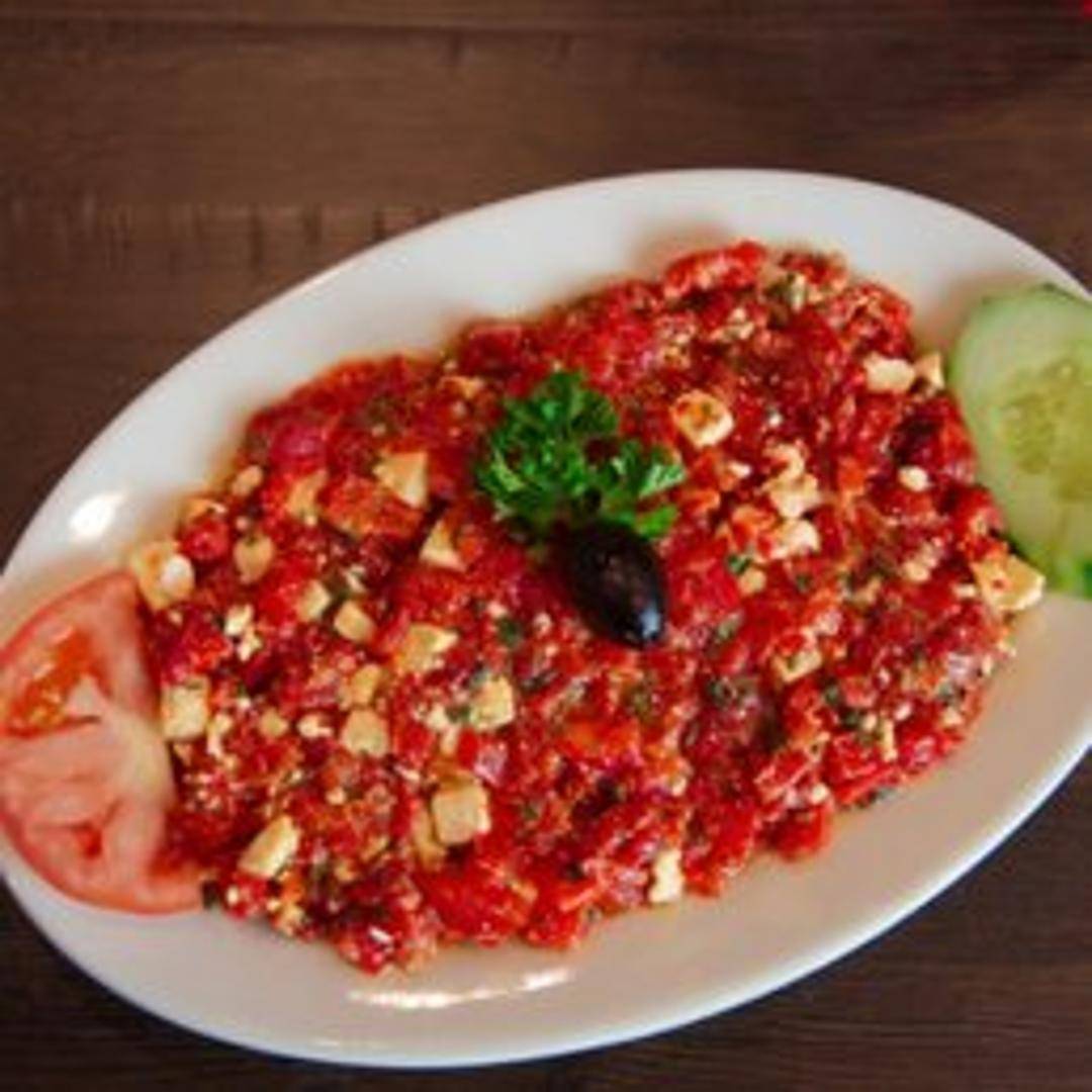 Delight your palate with Ezme, a vibrant and spicy Turkish salad or dip. This refreshing blend features finely chopped tomatoes, cucumbers, onions, green peppers, and parsley, seasoned with pomegranate molasses, olive oil, and a touch of red pepper paste for a zesty, flavorful kick.