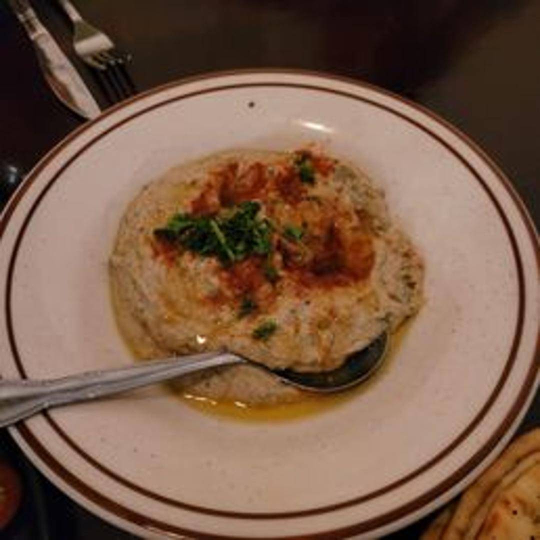 Smoked and mashed eggplant dip blended with tahini, garlic, lemon juice, and olive oil. Served with warm pita bread for dipping.