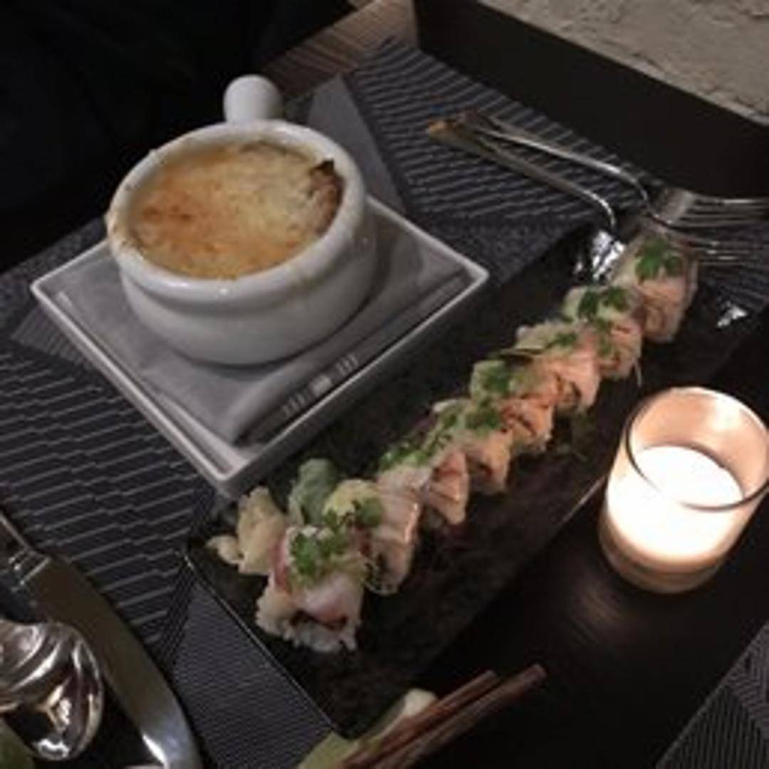 A flavorful fusion soup combining elements of Vietnamese Pho and French Onion Soup. A rich beef broth base infused with aromatic spices, featuring caramelized onions, and likely topped with fresh herbs and possibly cheese or bread.