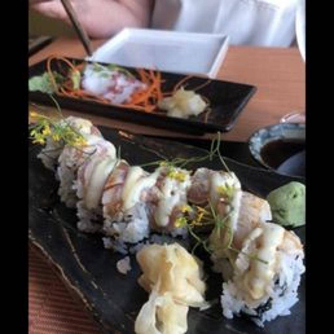 A California roll topped with thinly sliced avocado and a drizzle of eel sauce. Contains crab, avocado, cucumber, and sesame seeds.