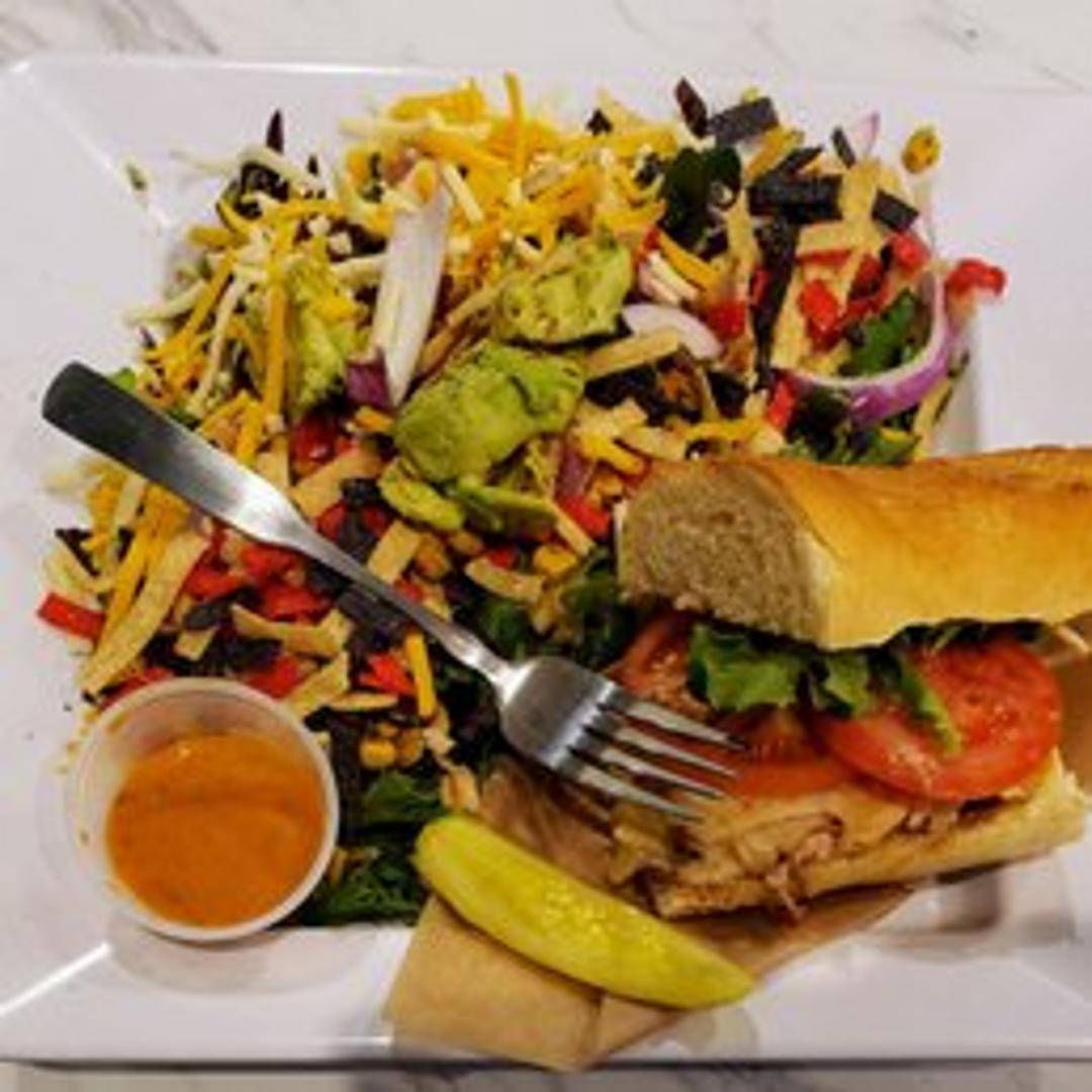 Fresh avocado, mixed greens, grape tomatoes, cucumbers, red onion, carrots, and your choice of dressing.