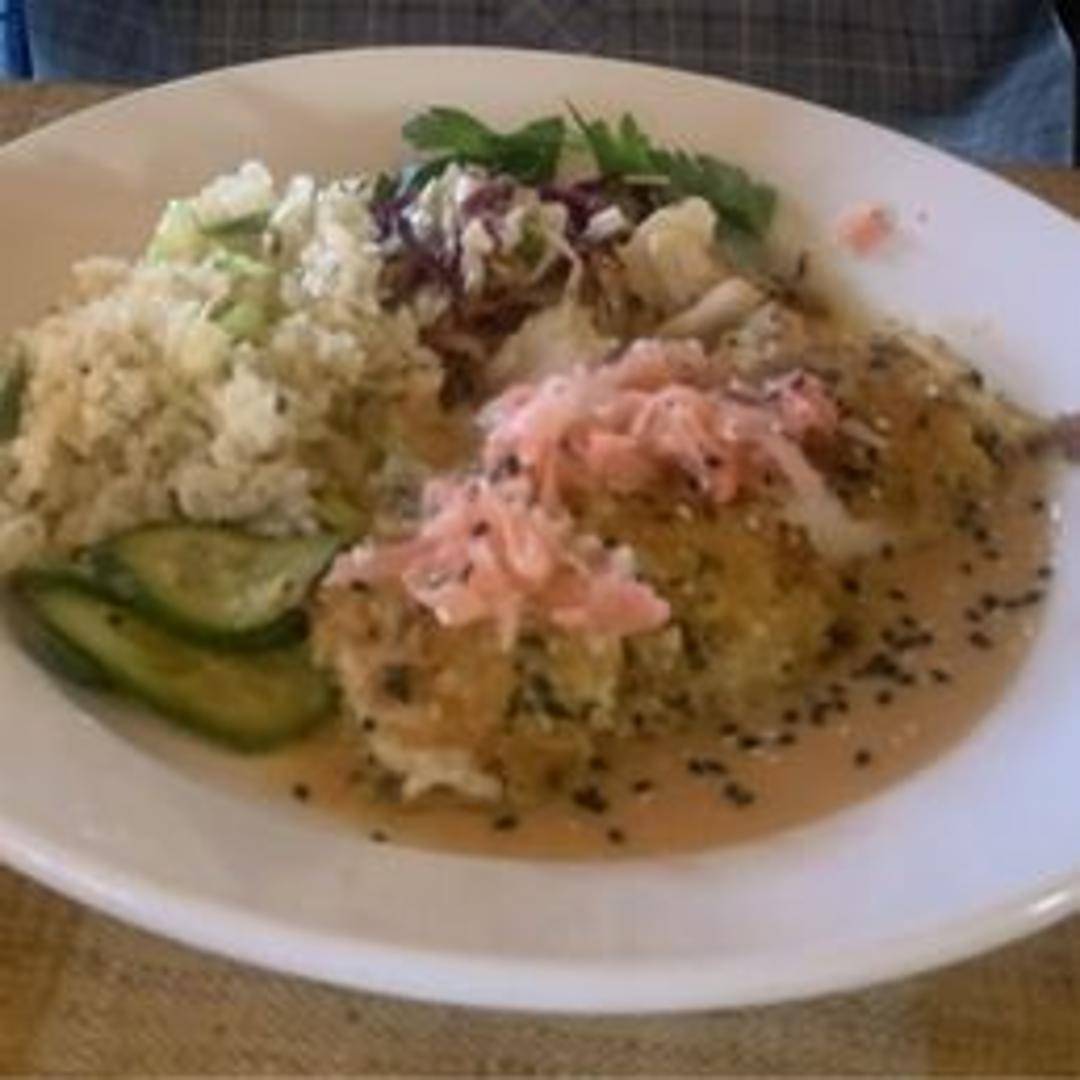 Fresh halibut fillet coated in a crisp macadamia nut crust, pan-seared to perfection and complemented by a delicate sauce, seasonal vegetables, and a side of rice or couscous.