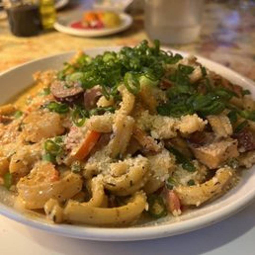 Penne pasta tossed in a spicy Andouille sausage and chicken jambalaya sauce with peppers, onions, and tomatoes. Garnished with green onions.