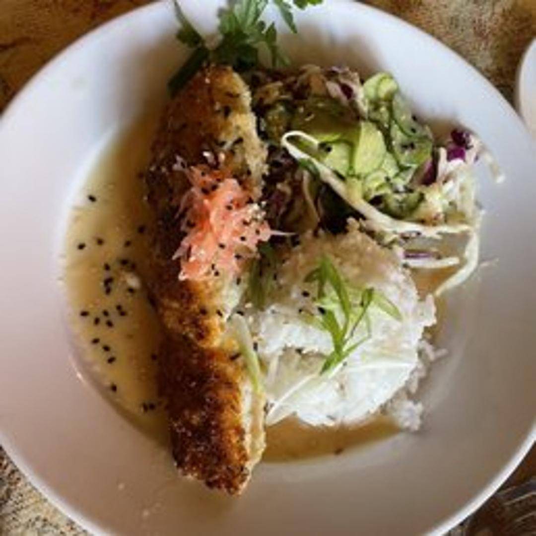 Pan-seared salmon encrusted with macadamia nuts. Finished with a light citrus sauce and served with rice pilaf and sautéed spinach.