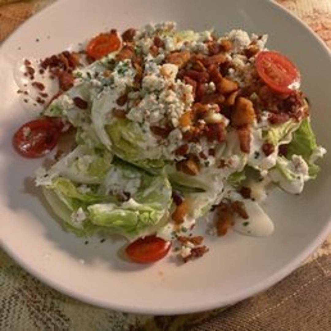 A crisp wedge of iceberg lettuce topped with bleu cheese dressing, crumbled bacon, and diced tomatoes.