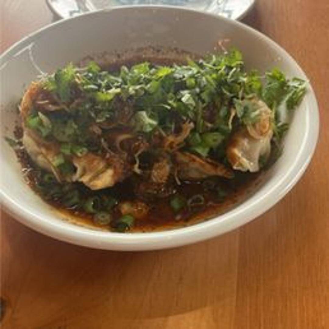 Dumplings filled with pork and vegetables, tossed in a spicy chili oil sauce, and topped with sesame seeds and scallions.