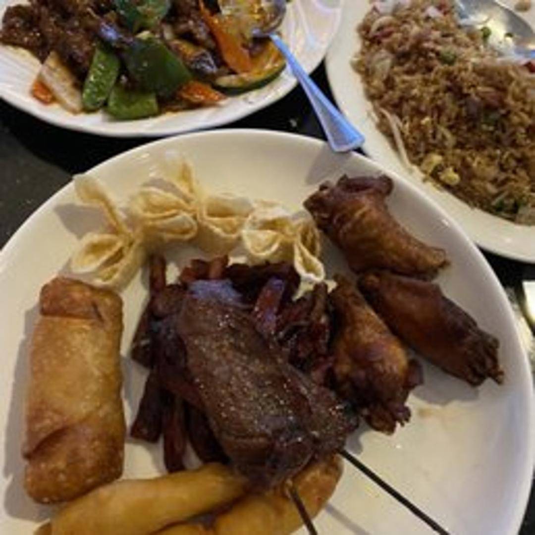 Tender slices of beef stir-fried with garlic and a savory sauce, served alongside a choice of starch or vegetable.