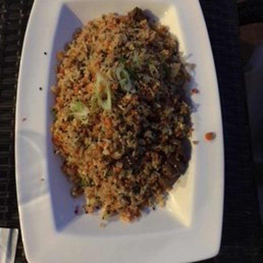 Savory fried rice stir-fried with tender, sliced steak, mixed vegetables (peas, carrots, corn, and onions), and scrambled egg. Seasoned with soy sauce and traditional Japanese spices.