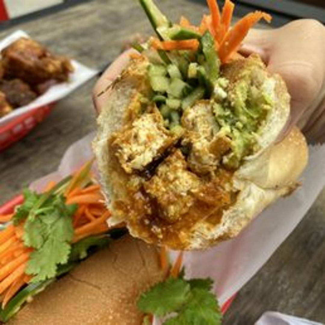 A flavorful Vietnamese sandwich featuring marinated and pan-fried spicy tofu, pickled carrots and daikon radish, fresh cilantro, sliced cucumber, and a spicy sriracha mayo, all served on a toasted baguette.