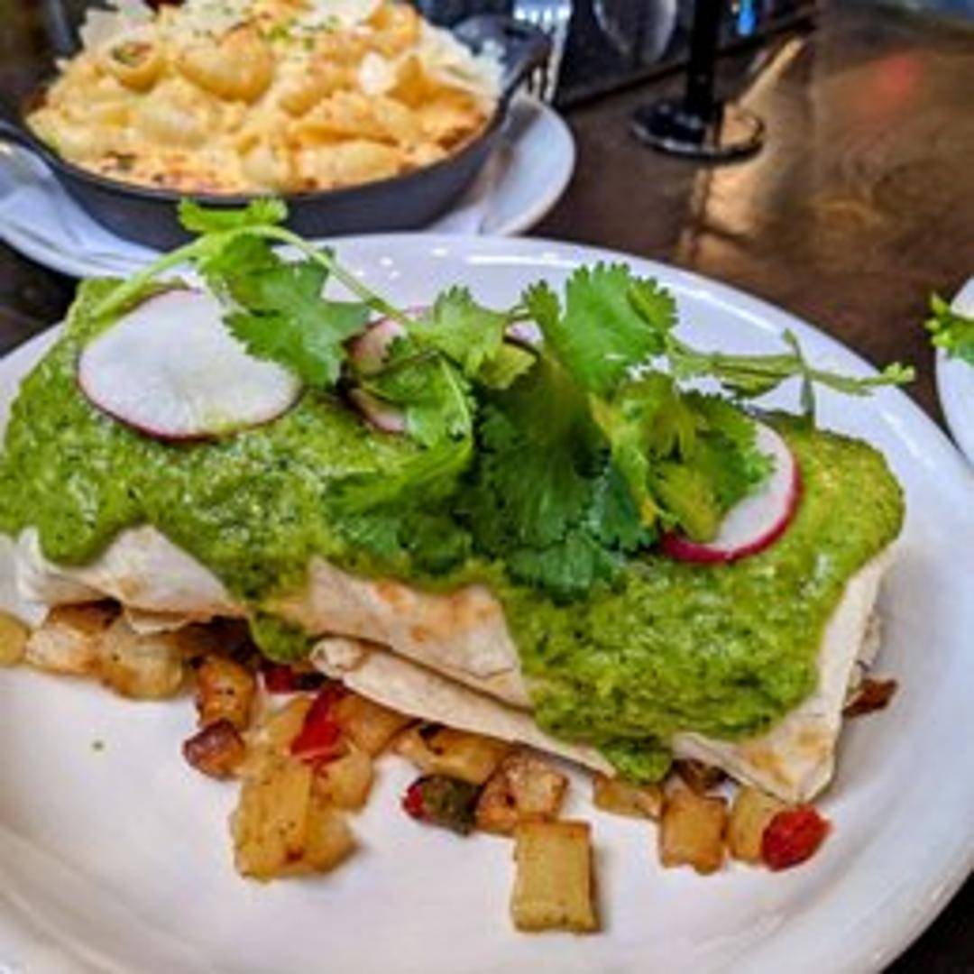A hearty breakfast burrito stuffed with scrambled eggs, your choice of breakfast meat (bacon, sausage, or chorizo), cheddar cheese, potatoes, and pico de gallo. Smothered in a rich and savory green chili sauce and topped with sour cream.