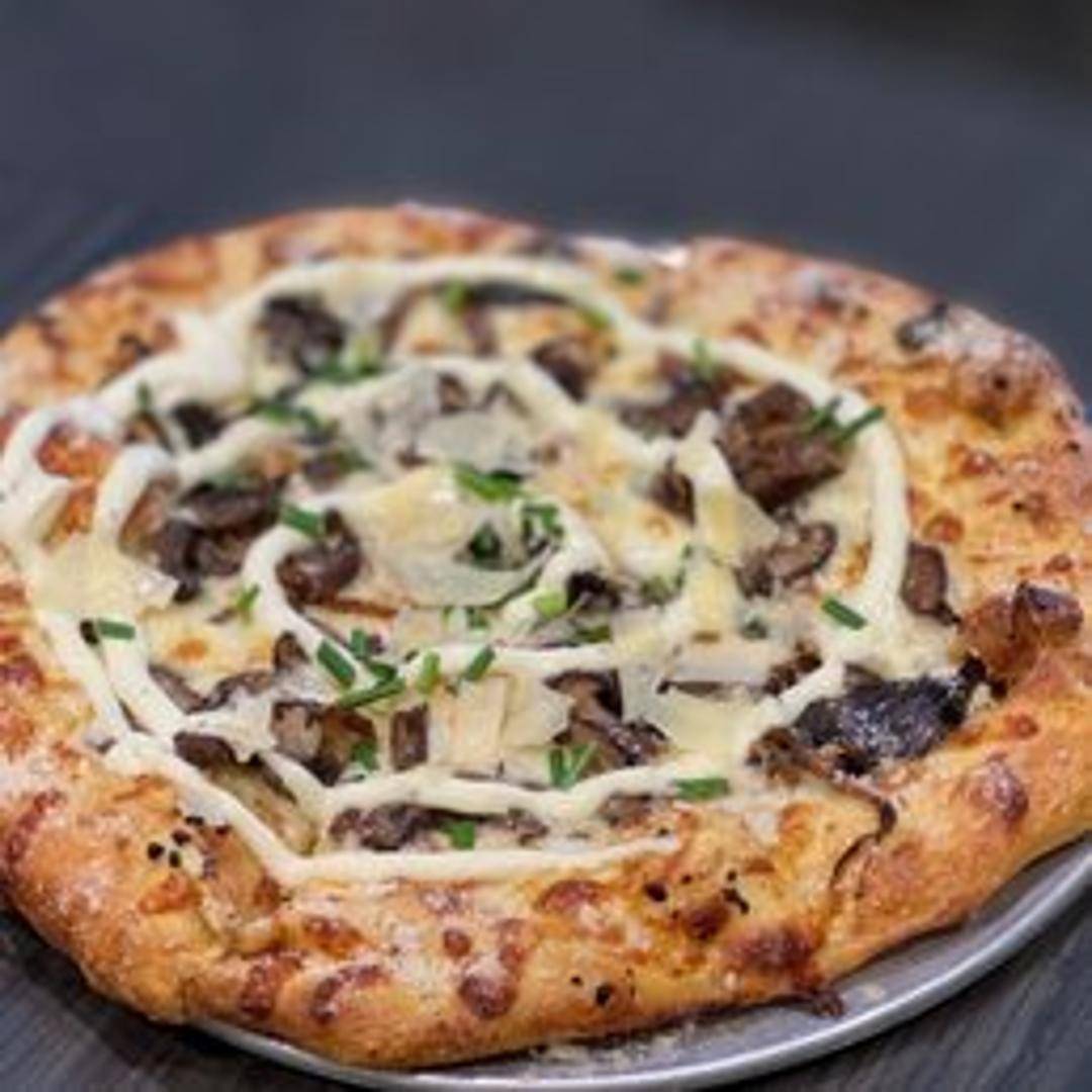 An olive oil and garlic base with mozzarella, shiitake, button, and portobello mushrooms. Caramelized onions and MontAmoré cheese. Finished with a garlic aioli swirl and a sprinkle of parmesan.