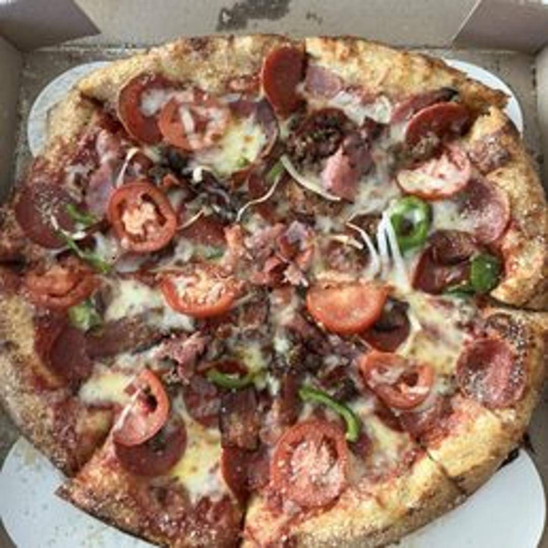 Red sauce base, mozzarella, pepperoni, sausage, ground beef, ham, mushrooms, green peppers, black olives, and onions. A hearty and flavorful combination of classic pizza toppings.