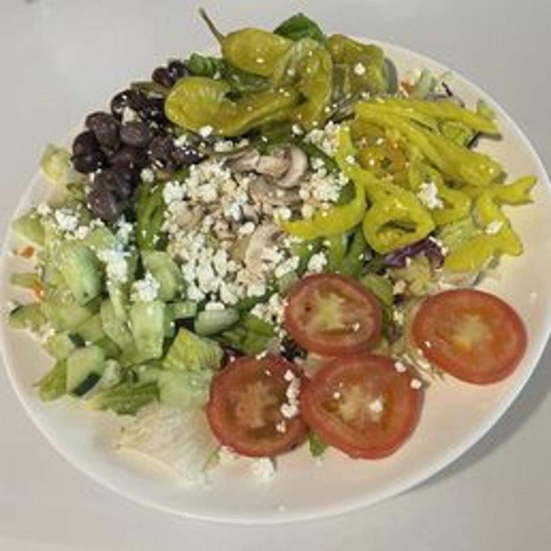Crisp romaine lettuce, feta cheese, Kalamata olives, cucumbers, tomatoes, red onions, and banana peppers tossed in Greek dressing. A Mediterranean-inspired salad.