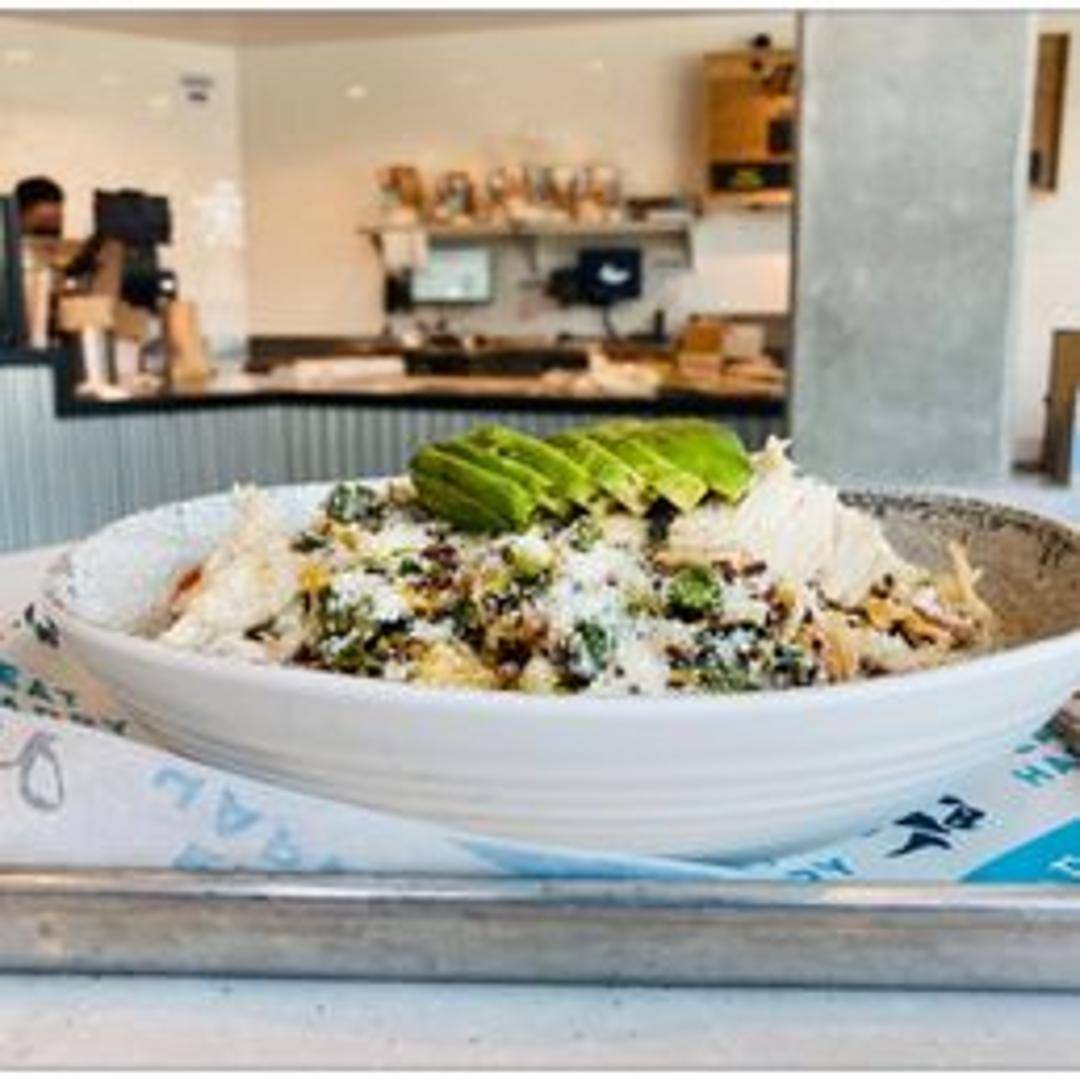Quinoa and millet, black beans, roasted corn, avocado, cilantro, red onions, crumbled feta, grape tomatoes, and superfood krunchies tossed with a lemon-herb vinaigrette.