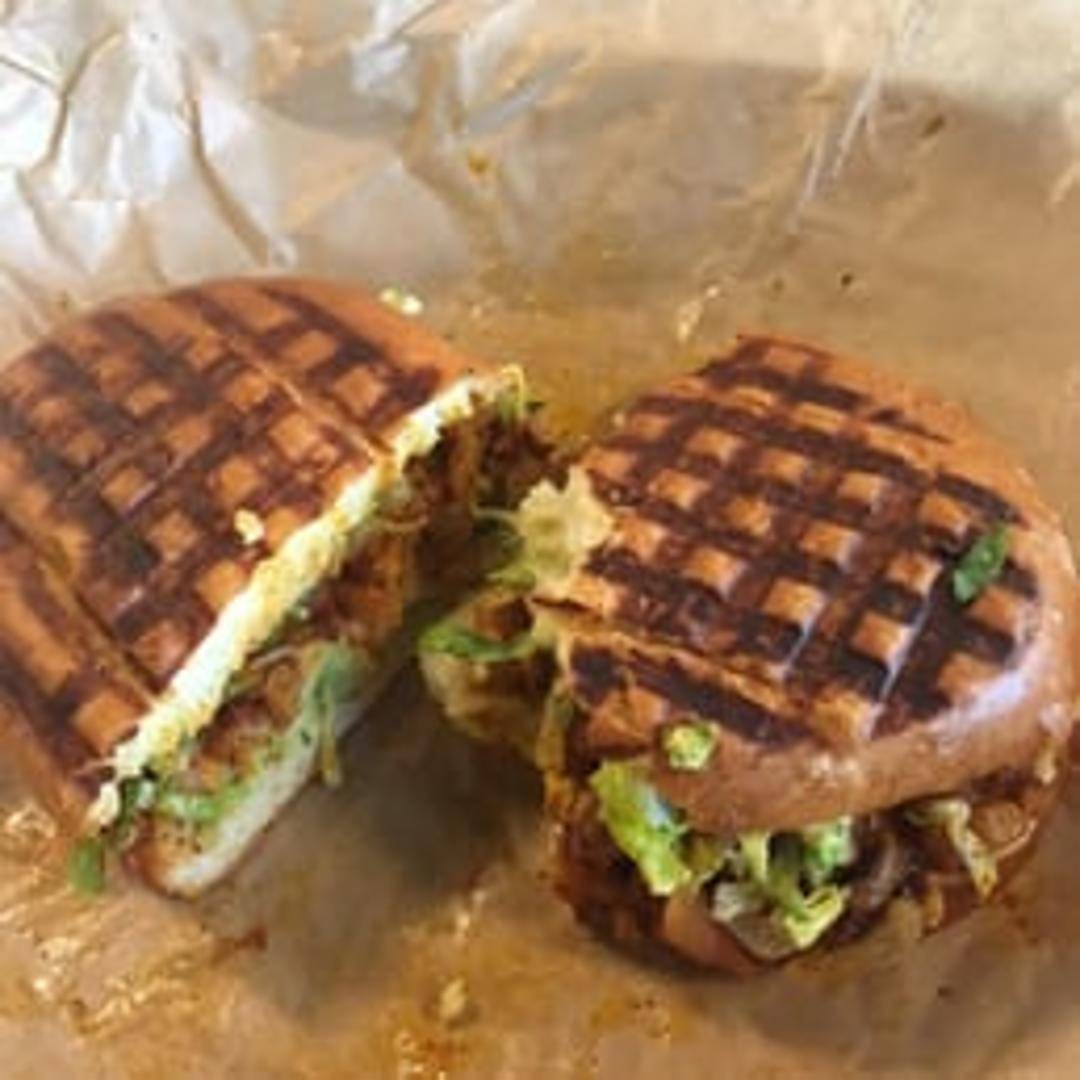 Asparagus, Pea Tendrils, Goat Cheese, Pea Pesto, Green Garlic Aioli and Balsamic Glaze on Ciabatta.