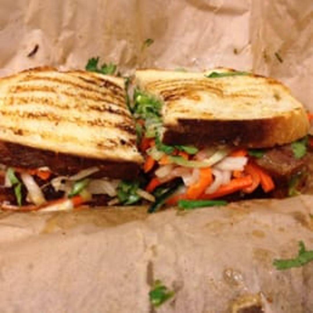 Choice of pork or tofu, marinated in sweet chili sauce with pickled daikon & carrots, cilantro, jalapenos, and a creamy vegan mayo on a toasted ciabatta roll.