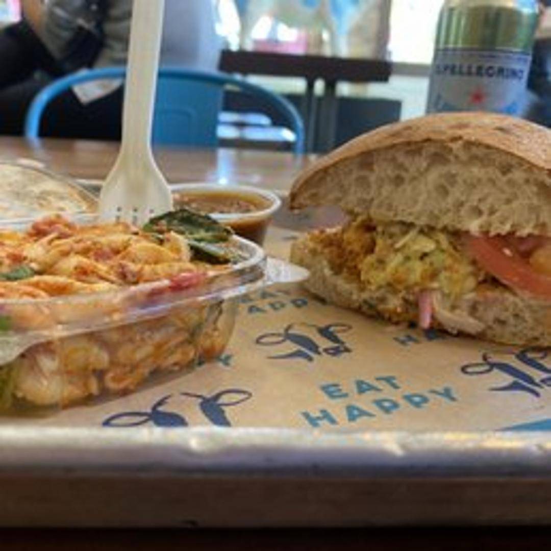 Rotini pasta tossed with roasted vegetables, olives, feta cheese, and a lemon-herb vinaigrette.